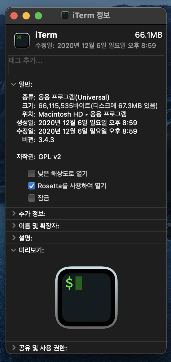 터미널이 "Rosetta"를 사용하여 실행되도록 설정